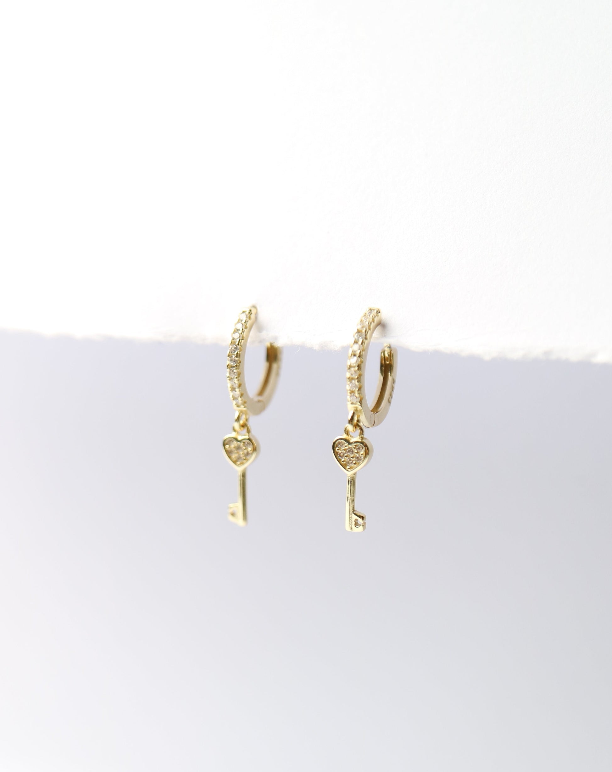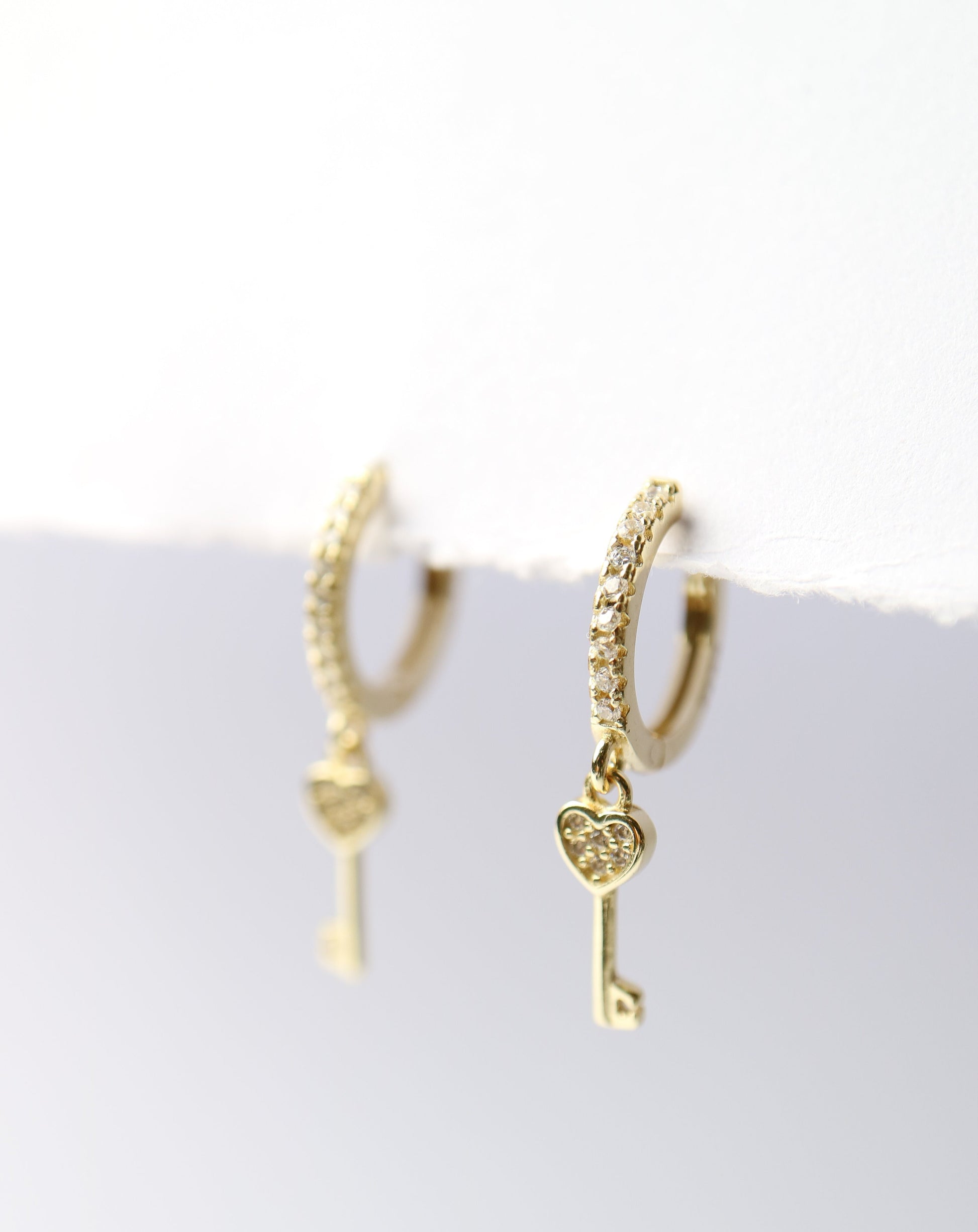 The Key to my Heart Huggies from Kini Jewels are made from solid sterling silver and plated in 14kt gold, pavé-set with brilliant white cubics. Each huggie shows off a delicate key dangling from its base, with the top part of the key shaped like a heart and set with brilliant, sparkling cubics.
